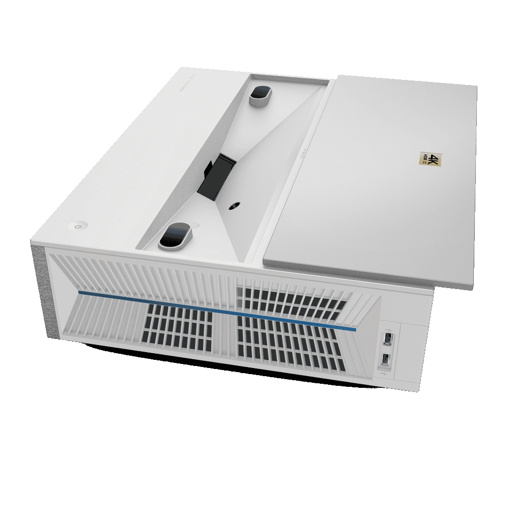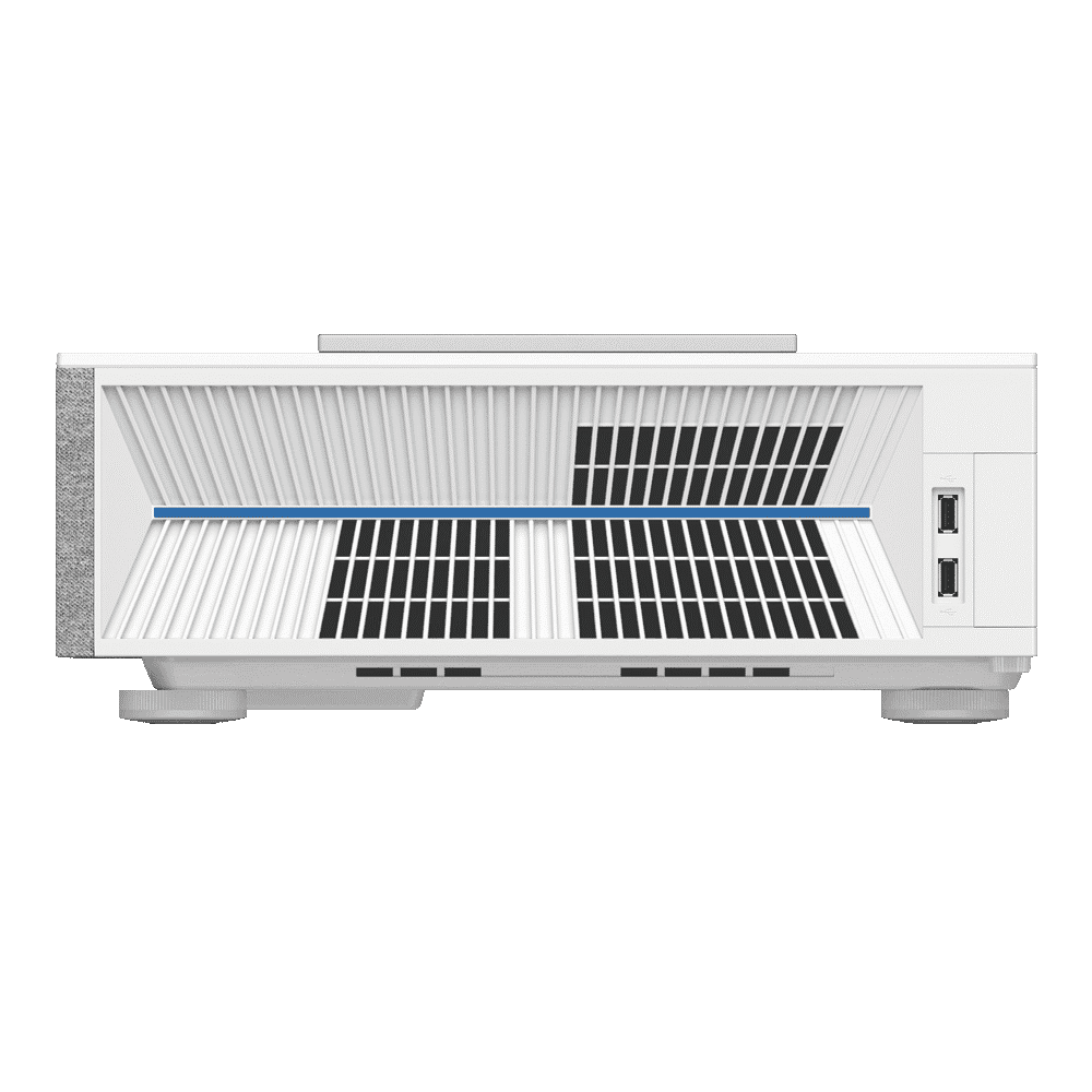 機身側方有兩組連接 USB 隨身碟播放多媒體檔案的 USB 端子,讓你將雷射電視定位後,無須費力地在貼牆面端子區找連接埠。 另外,機身側邊魚骨型的散熱柵,兼顧時尚、垂直的散熱柵設計,也可避免灰塵堆積。