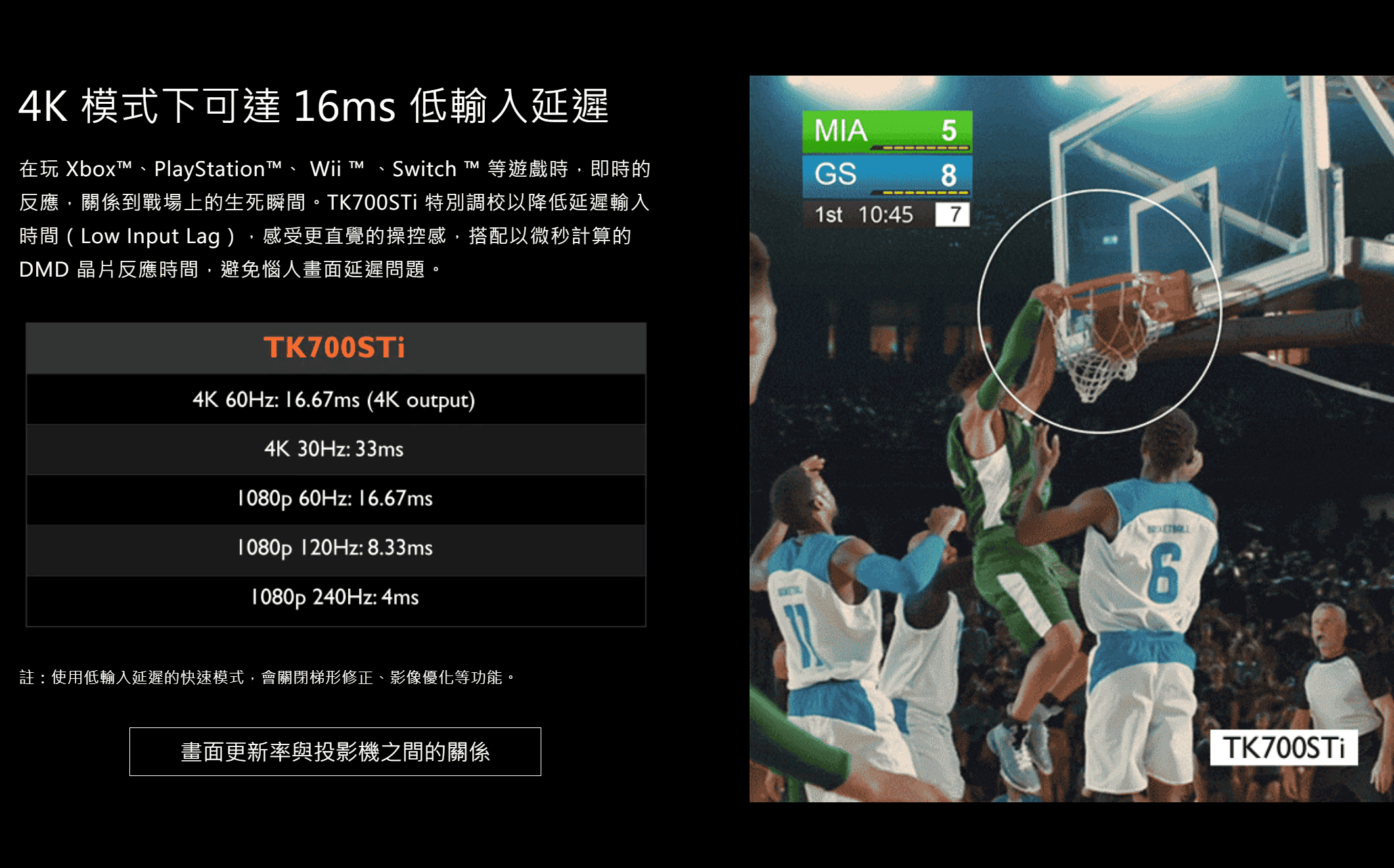低遊戲延遲,主要推廣滯後時間為16.67毫秒,無論解析度如何,遊戲模式都適用於60Hz內容。對於投影機來說,這是非常傑出的性能。