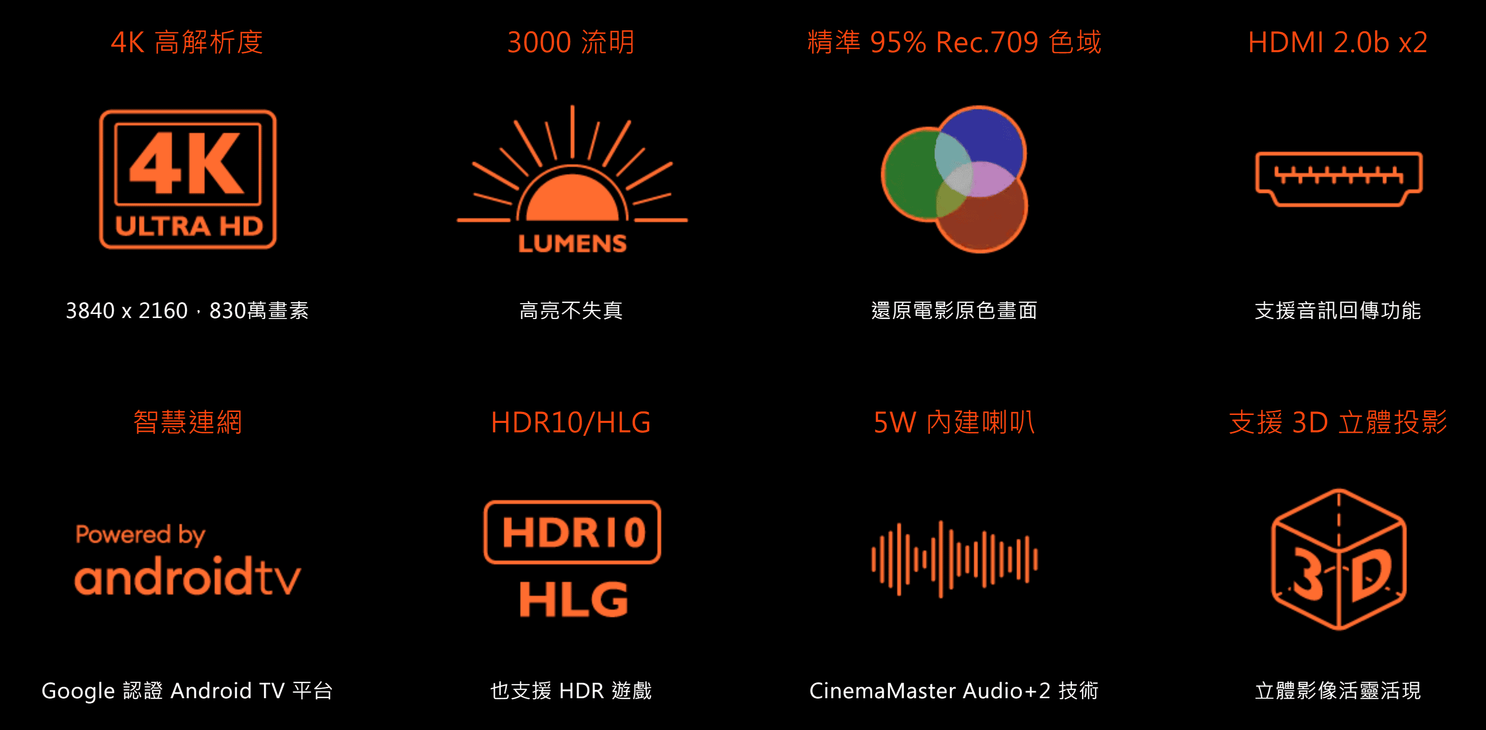 · 3000高流明亮度,支援 4K HDR 遊戲、精準呈現95% Rec.709色域