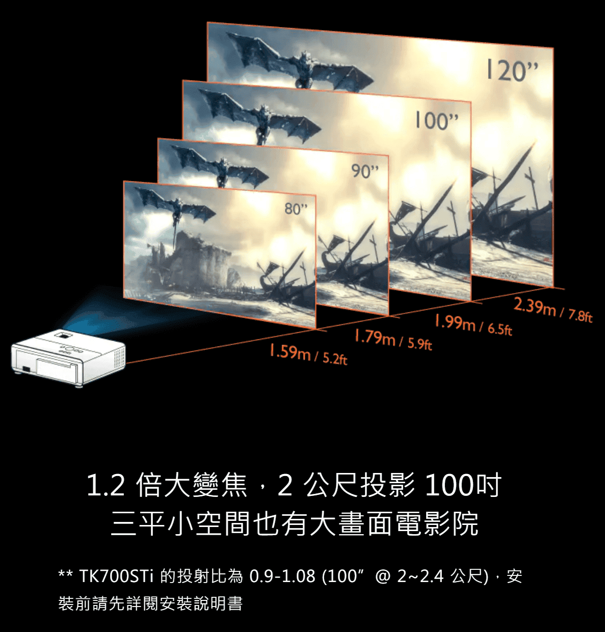 · 短焦投影設計,120吋大畫面僅需 2.3~2.8公尺