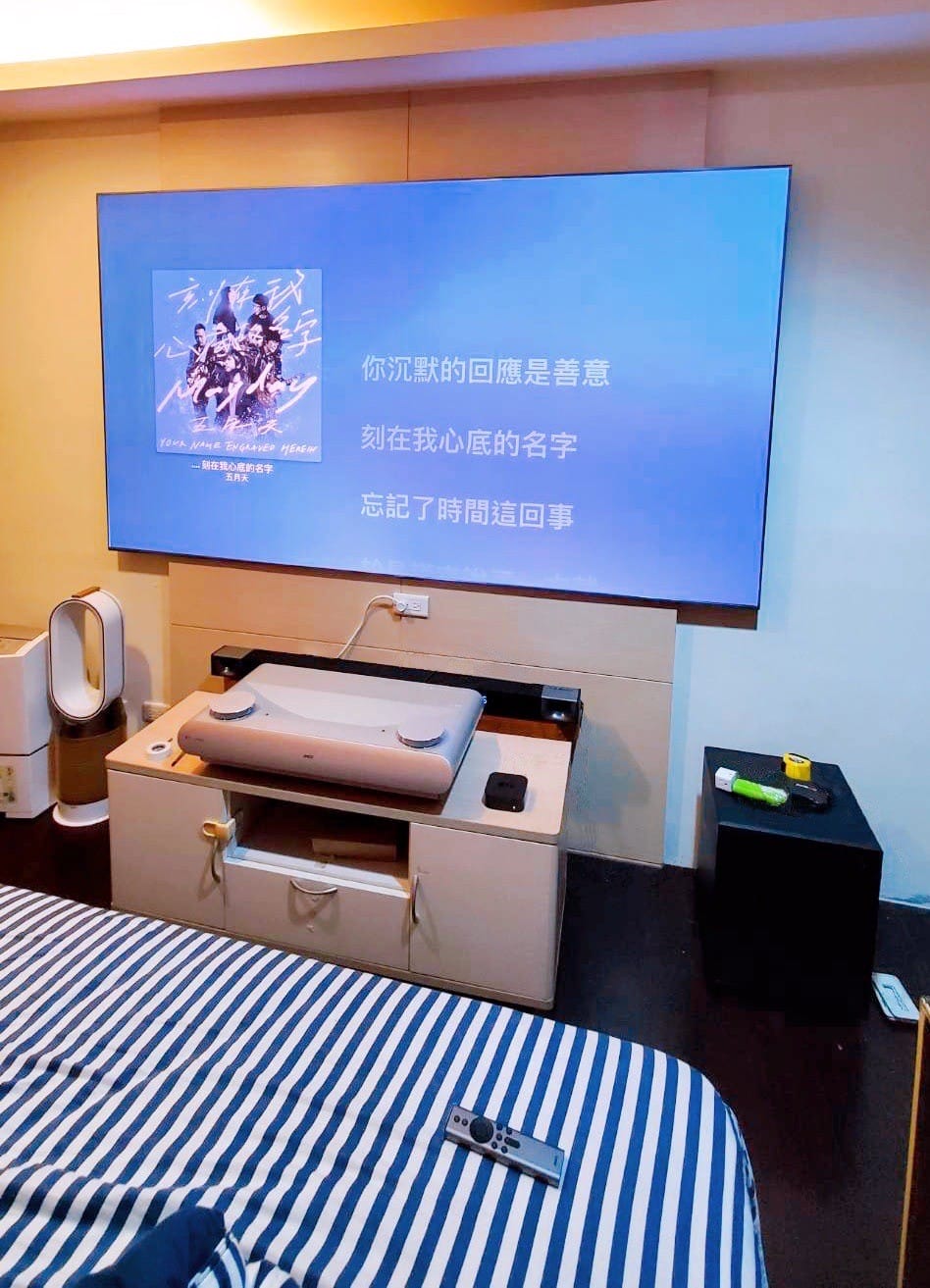 極米AURA作為極米新出的短焦系列, 它的功能一定不會輸其他家廠牌,官方的數據顯示離幕20公分即可投影100吋,最大投影達150吋,投射比:0.233:1色彩解析度一樣支援HDR 10顯示色彩:10 bit,1.07 Billion colors,輸入:HDMI 2.0x3(HDMI 1支援ARC)、USB 2.0x3、LANx1、Mini USBx1(維修用)輸出:AUXx1、Opticalx1,內建的喇叭為30Wx2(Harman Kardon),而且裡面內建安卓TV可以馬上聯網收看YOUTUBE NETFLIX等等的串流媒體。