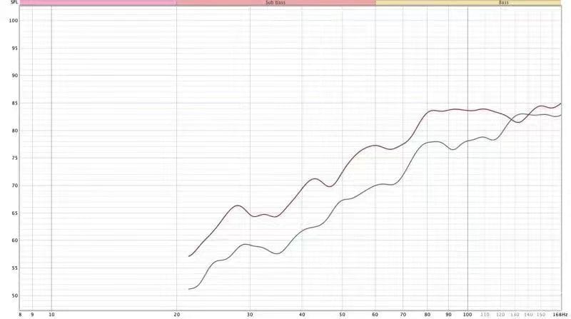 D95離牆1米(藍色)和完全貼牆(紅色)下低頻部分的區別,可以看到從130Hz以下能得到較高的增益,數據僅供參考