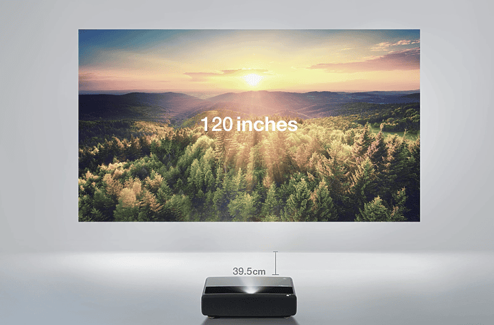 39.5cm可以打出120吋的畫面、30CM達105吋,4LED光源講求環保、低耗能、高散熱換取高達30000小時的燈泡壽命。嚴格來說依目前市面的雷射電視比較此技術落後於其他品牌~甚至連epson都已經開發出僅需9.8cm的機體,但因為本身機身小比較不占空間其實這才是Optoma L1+的賣點。
