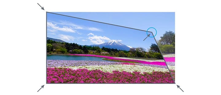 在垂直和水平平面中調整梯形失真校正。您可以單獨扭曲圖像的每個角以創建完美的方形圖像。非常適合不平整的牆壁或投影機放置不便且需要傾斜安裝的地方。