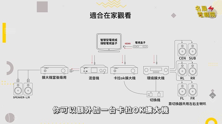 家庭劇院是為「電影」設計的,重點在於營造空間感和環繞定位:像槍聲從左邊飛過去、爆炸聲從後面轟來。但卡拉OK不一樣,唱歌的重點是: