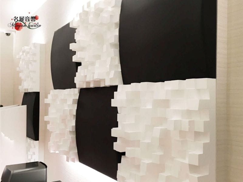 照片這個視聽空間左後方的吧台,視聽室後牆是一大片光滑的牆面 如果不處理將有大量的聲波反射,梁老闆的作法是除了在牆壁裡做了吸音處理外 牆面也以吸音板及擴散板交錯配置,並以黑白兩色帶來變化,上下兩端也加上 間接式照明營造氣氛。