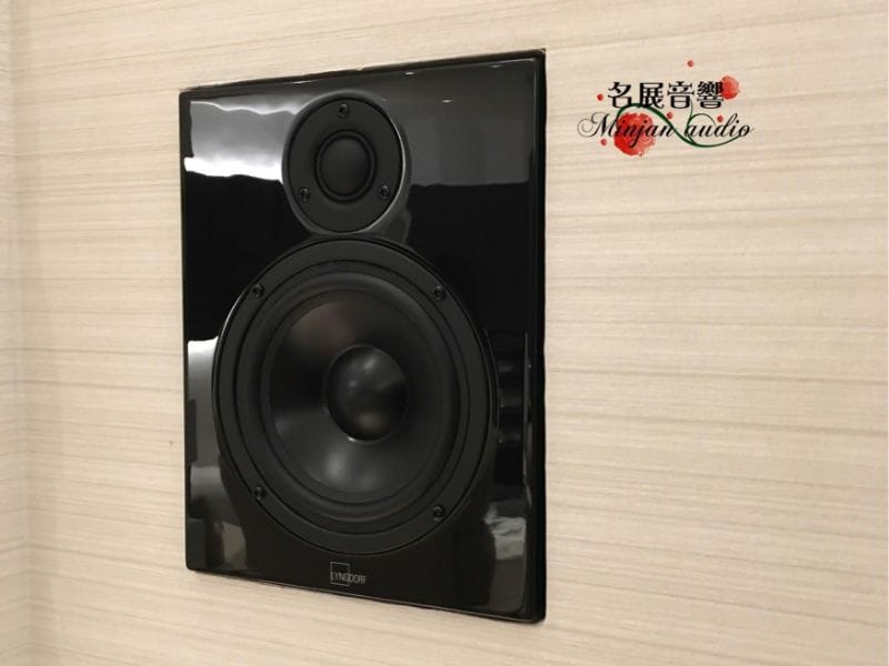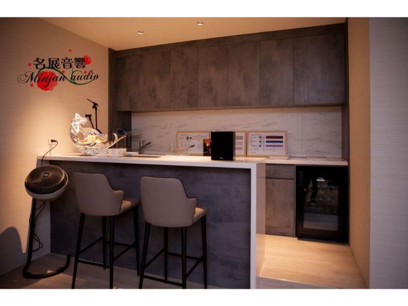 Lyngdorf MH-2的音箱深度只有9.5公分,除了能夠很容易地嵌入牆面 也可掛在牆面使用。Lyngdorf將MH-2的喇叭端子「埋」在音箱背面裡 也在音箱背面設計了可以容納喇叭線的凹槽,想要把Lyngdorf MH-2掛在牆壁上 並且不露出喇叭線的話,絲毫都不會有困難。上面這張照片是在視聽室左後方的 吧台後方拍攝的,擔任左側環繞聲道的Lyngdorf MH-2就直接放置在吧台桌面上 其高度與其他Lyngdorf MH-2是相同的,喇叭線則由後下方的吧台桌面穿出 顯然名展梁老闆的規劃十分完善。