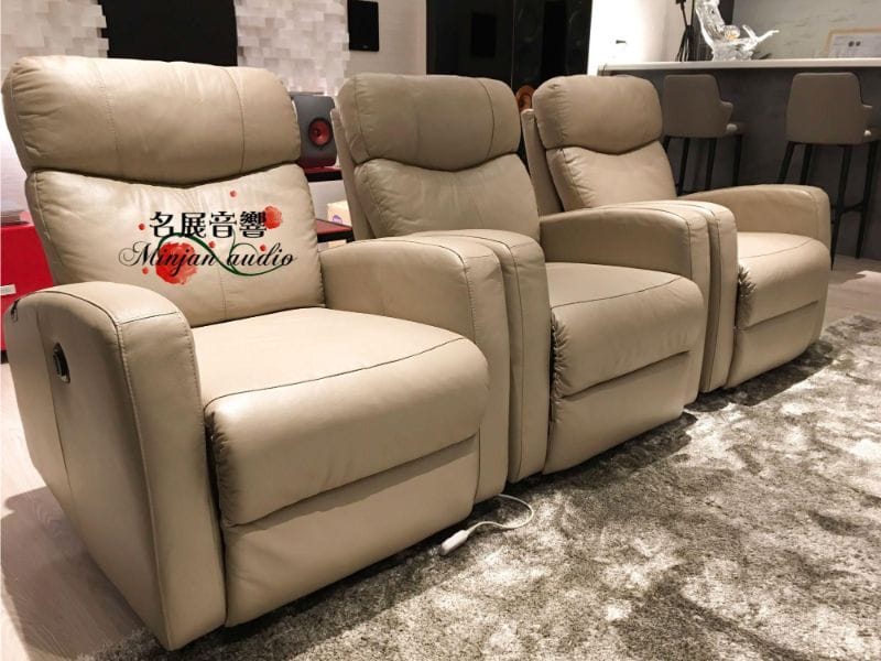 雖然強調優異的視聽效果,舒適的座椅也不可少,梁老闆準備的是豪華的 個人式真皮沙發,而且靠背與腳靠均可電動升降,能讓人非常舒適地半躺著觀賞影片 搭配的投影機是JVC DLA-X570R,安置在視聽室天花板後方的電動升降架上 平常不使用時可以升起藏入天花板內。在後牆主要的聲波吸收及擴散板 兩側牆面上各有一小塊黑色方形物件,那是視聽室的後方環繞喇叭。
