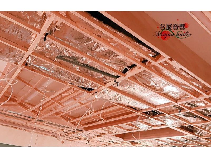 當然,名展這間視聽室絕不會只有「金玉其外」,天花板、牆面與地板內的處理 才是真功夫之所在,從幾張梁先生所提供的施工過程中拍攝之照片 就可看到整體規劃之用心。上面這張是天花板封板前的照片 可以看到左下角天花板「斜坡」內的角材,也可以看到天花板內塞滿了吸音岩棉。