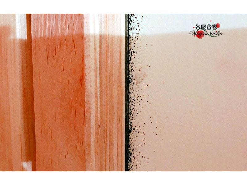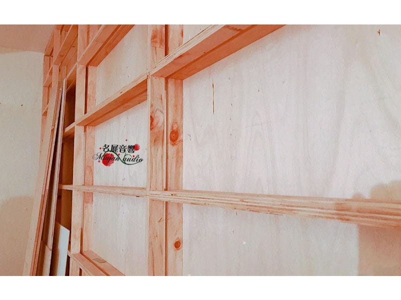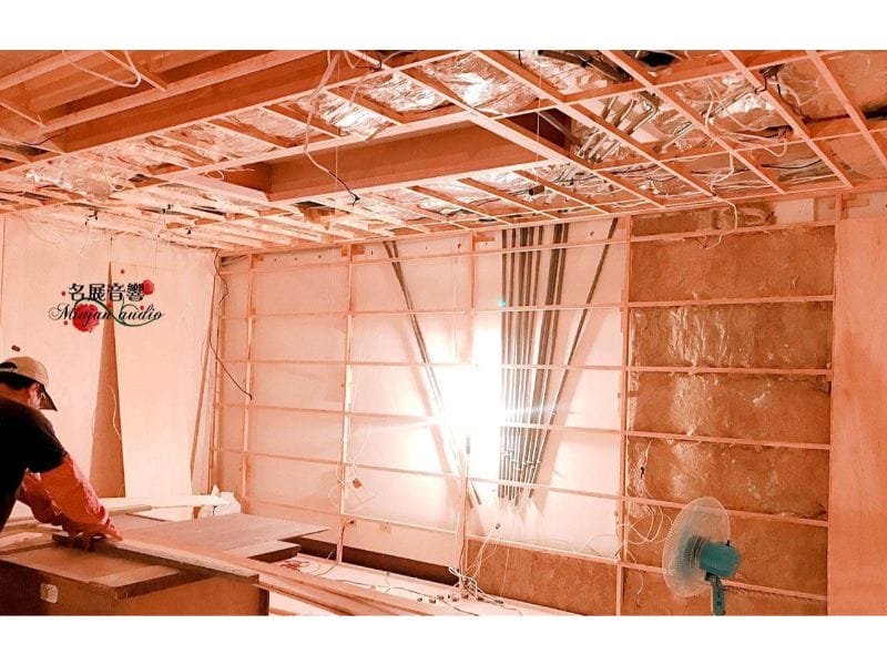 隔間牆使用了雙層角料再以厚實的實心板封板(裡面當然也會塞滿吸音岩棉) 為的是良好的隔音與音響效果表現。隔間牆角材與牆壁接觸面之間有抑震膠條。