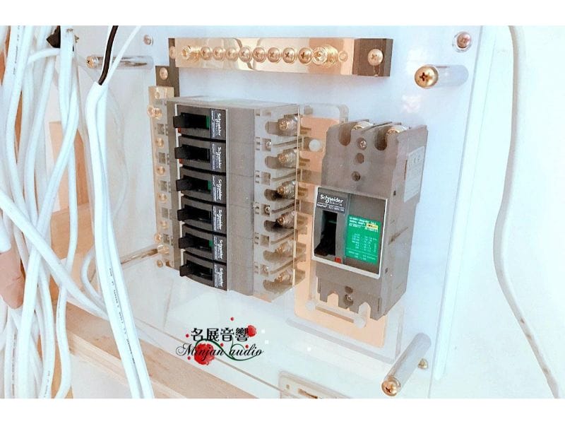隔間牆角材與地板之間同樣有抑震膠條,除了降低隔間牆牆面的震動共鳴外 別忘了有不少支環繞喇叭也是裝設在牆面上的。 天花板、牆面與地板的處理都那麼慎重,自然電源部分也絕不能馬虎。 名展桃園旗艦館視聽室使用台中MYSTJ Audio Design所設計規劃的頂級電源箱, 來提供影音系統的電源專線 以大電流鍍金銅排與德國Schneider無融絲開關來提升影音系統之表現。