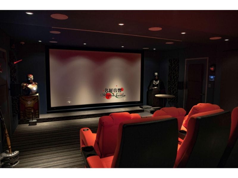 名展桃園旗艦館外側這間視聽室以「超級家庭電影院」氛圍規劃 除了有媲美專業電影院的階梯狀座椅、Stewart更大尺寸的 固定框銀幕、Sony VPL-VW550ES 4K投影機,聲音部分更是由Trinnov Audio 超級多聲道處理前級、多聲道後級與Procella Audio喇叭所建構的11.2.8聲道 超級系統(前方三聲道及兩支超低音就如同電影院般藏在銀幕後)! 看看這視聽室裡的鋼鐵人、蜘蛛人、雷神之錘與星戰黑武士等布置,是不是讓人有深深沈浸於電影裡的感動?
