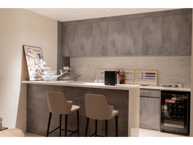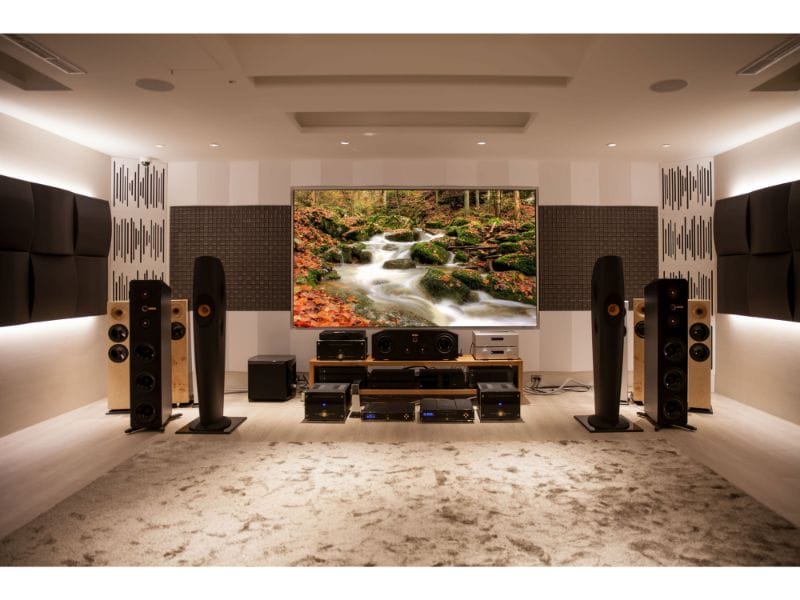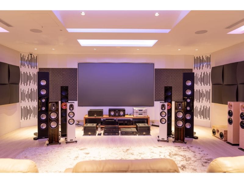 目前這個音樂視聽室用Lyngdorf 組成一個16聲道9.1.6的全景聲音場,相關介紹請點擊這裡,環繞喇叭部份因為此視聽室以音樂性為主,喇叭不用像電影視聽室一樣用到相當貴又大顆的等級,所以選擇Lyngdorf 壁掛小顆的小喇叭,再把相關尺寸與設計師討論好,做壁掛崁入。