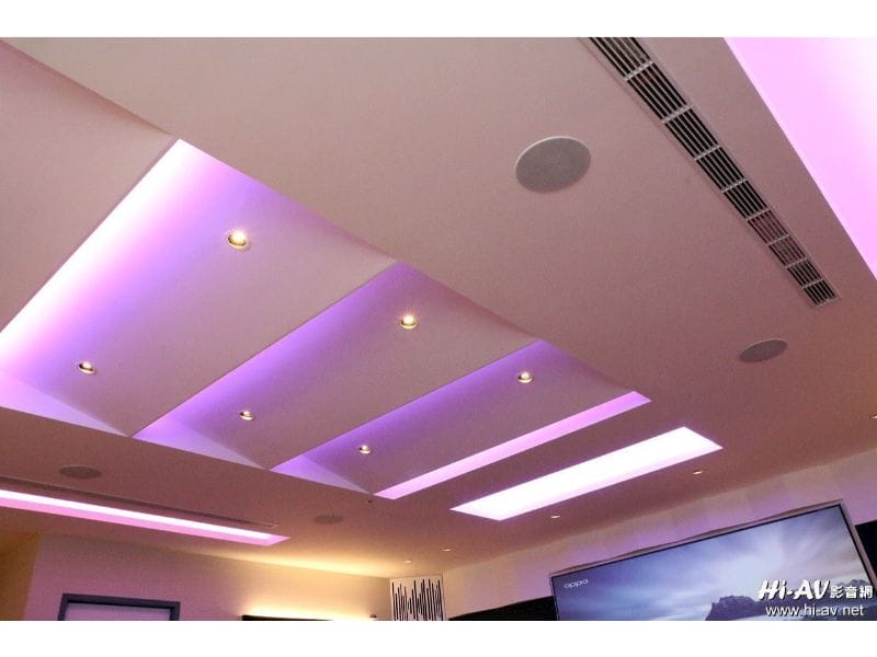 下圖我們利用環控系統,將部份彩色光關閉,LED崁燈燈光調整70%亮度,在看電視,演唱會等也能有畫質極佳的表現,又可以在這舒適的環境聽音樂,看書或做其他事情。有一個美麗的吧台也是音樂廳或私人招待所必備的地方之一,欣賞音樂的同時,喝喝紅酒,手工咖啡度過一個愜意的午茶時光.....