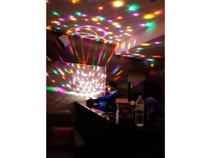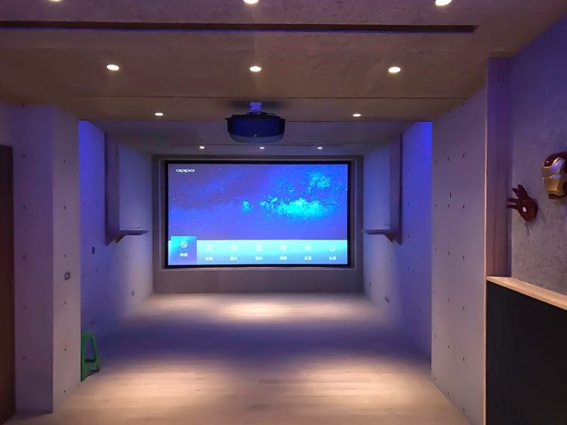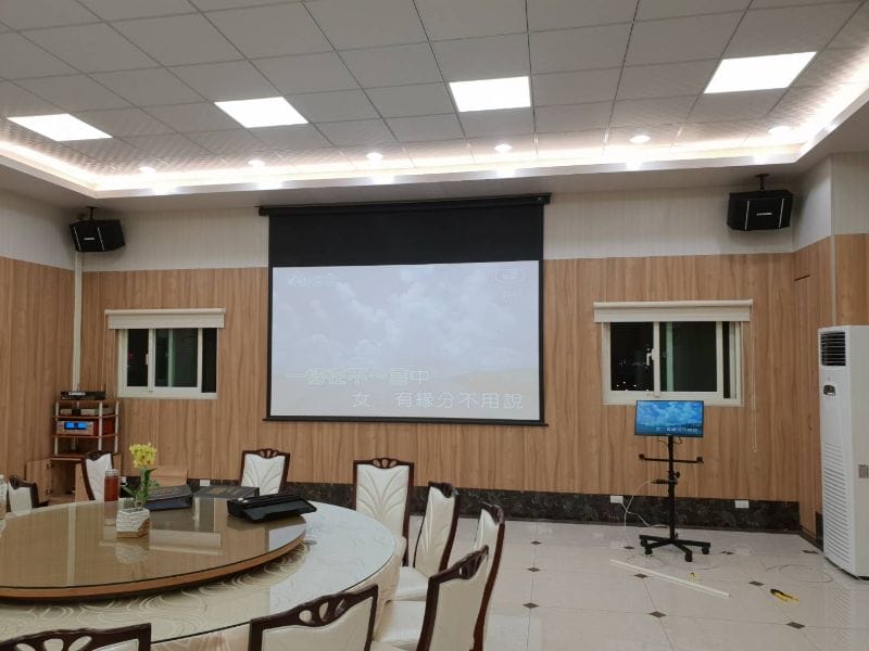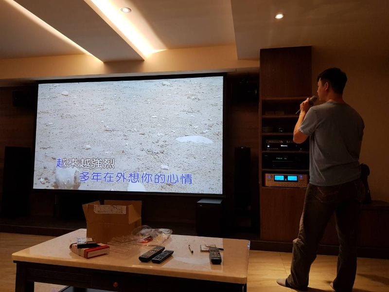 當然有些空間並沒有這麼大可以擺放這麼多喇叭,業主會希望卡拉ok能跟家庭劇院喇叭做結合,這個時候就是選擇一台好一點的混音機搭配AV環繞擴大機去做結合,當然重點就是卡拉ok調音時要盡量調整到避免出現回授的情況,這個時候就是考驗師傅的調音功力了~~下圖為業主用120吋布幕唱歌兼看電影,師傅大畫面專業調音中