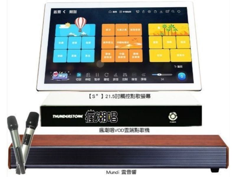 最後是目前最流行的瘋潮唱雲端點歌機,要唱什麼新歌從雲端直接下載 , 還有好樂迪點歌的觸控螢幕,螢幕可選擇桌面放置, 或是立架, 也可以手機App點歌,21吋大畫面, 整個家庭都是你的KTV。