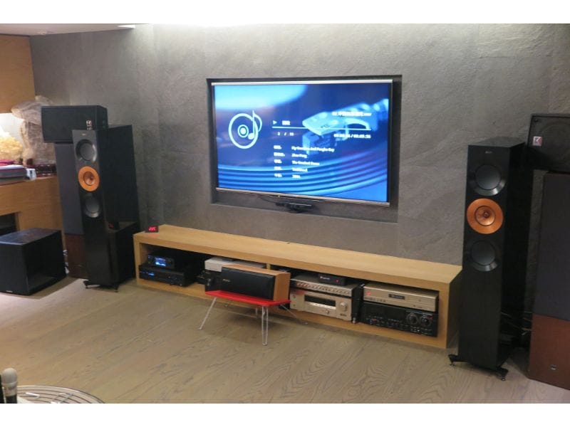 以下圖為例,業主吳先生使用最外側卡拉ok喇叭來當唱歌用的喇叭,這種喇叭通常便宜又耐操,但是音樂性就比較普通,內側喇叭則是看電影,音樂用的KEF 高階次旗艦Reference 3,把看電影聽音樂及唱歌完全分開,避免高階音響因唱歌使用不當的損壞,如果是專業視聽室,做透聲幕,可以把所有喇叭藏在布幕後面,讓裝潢更簡潔。