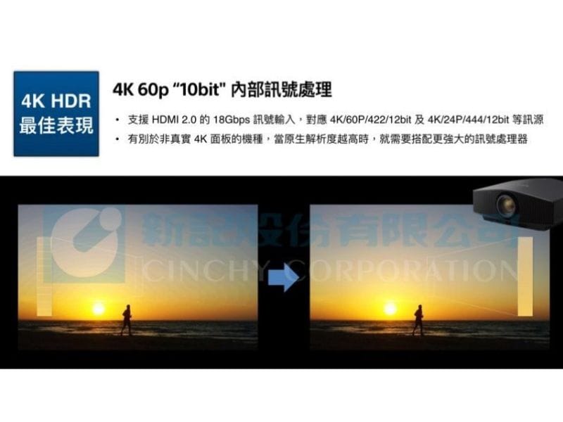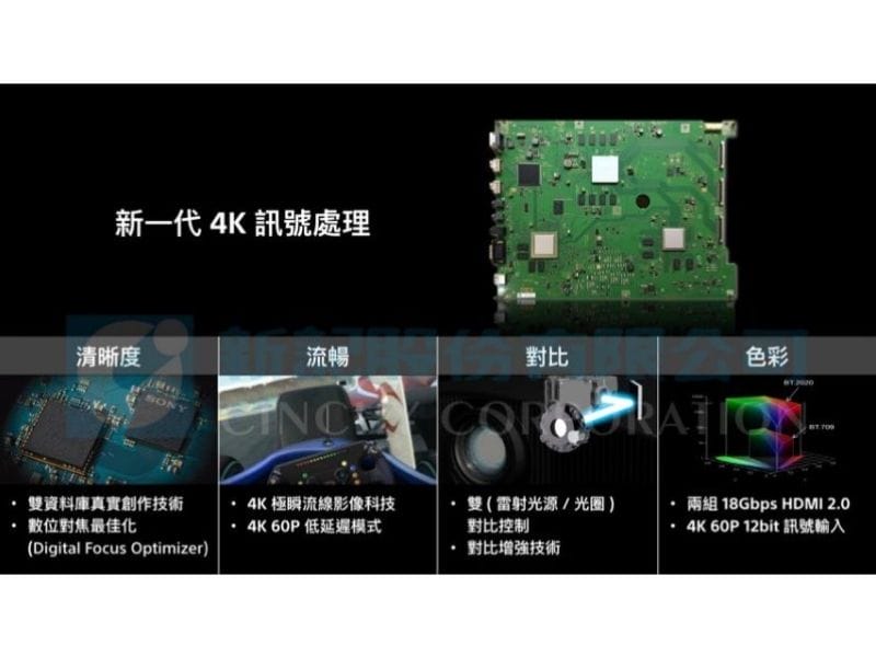 2019年機種使用新一代的4K訊號處理面板,清晰度部份新增了雙資料庫的真實創作,讓整個解析度更加提升逼近8K,新增數位聚焦優化,流暢度更加提升,對比則使用雙光源控制,色彩2組HDMI輸入都支援到18G HDMI 2.0 4K 60P 12bit。
