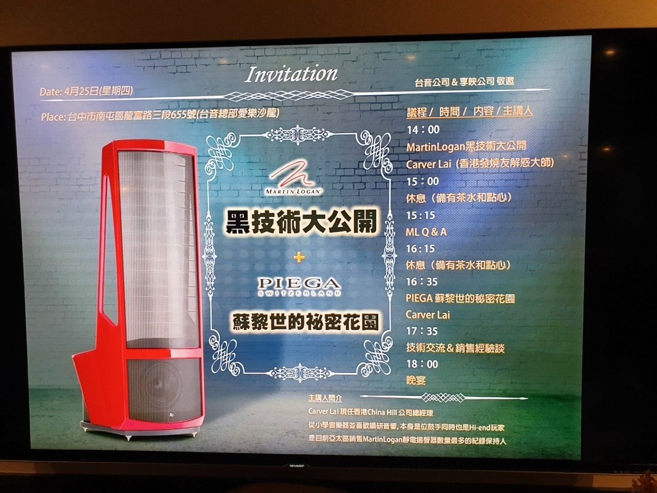 台中台音總公司新居落成一日遊 加拿大Matin Logan,瑞士PIEGA的代理商發表就醬結束了 今天我們聆聽的訊源都是使用 APPLE ITUNES整理的高解析數位音樂唷 擴大機搭配Anthem加拿大聖歌 一樣是台音公司代理的優質器材 回想起來,今天聽到最特別的聲音還是Matin Logan靜電喇叭 畢竟聲音特色與多數有箱體的動圈式喇叭不同,也歡迎您來名展音響體驗。