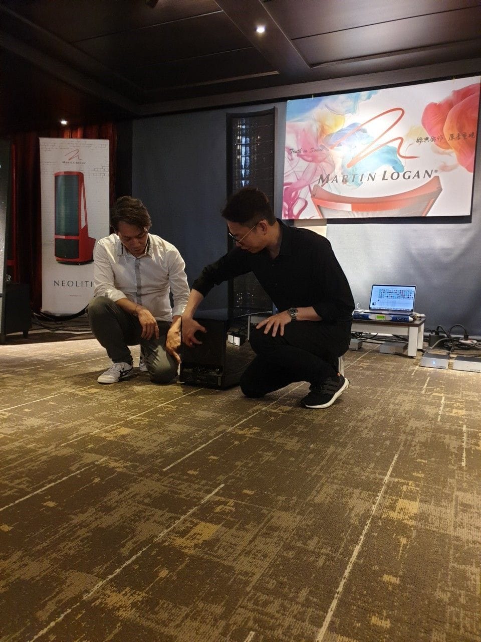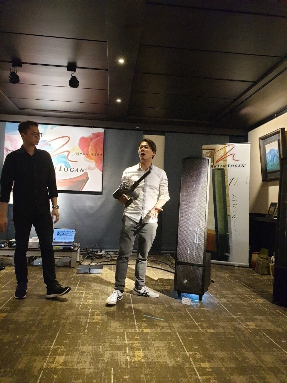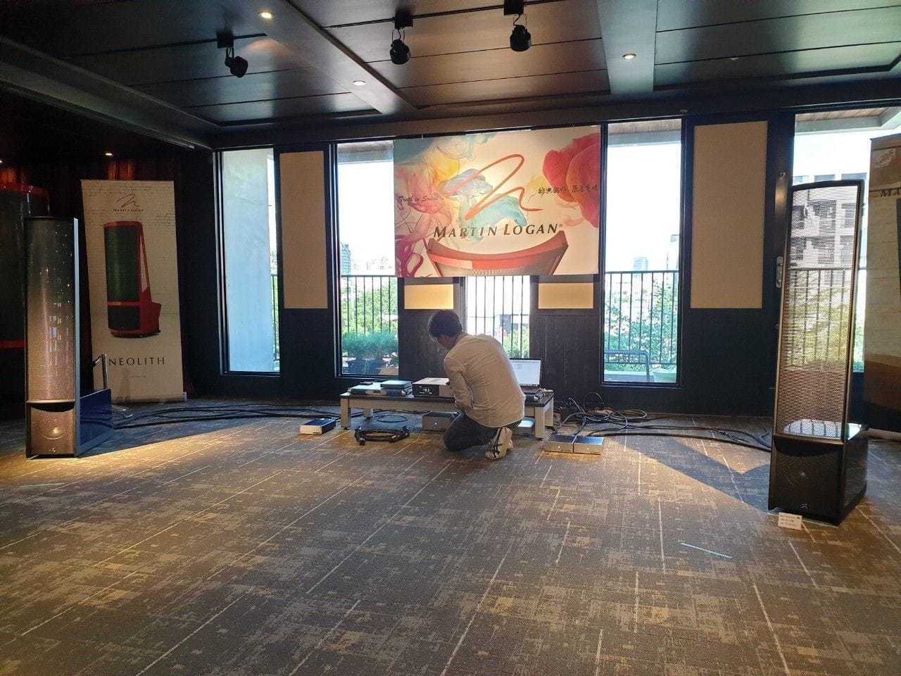 告別花草,告別羊咩咩,來到二樓這次活動的主軸~這裡有位白衣男子在調整音響器材 凡人的背影非凡的氣勢一般音響店少有靜電喇叭 Martin Logan Impression ESL 11A新世代旗艦靜電喇叭磅礡登場。