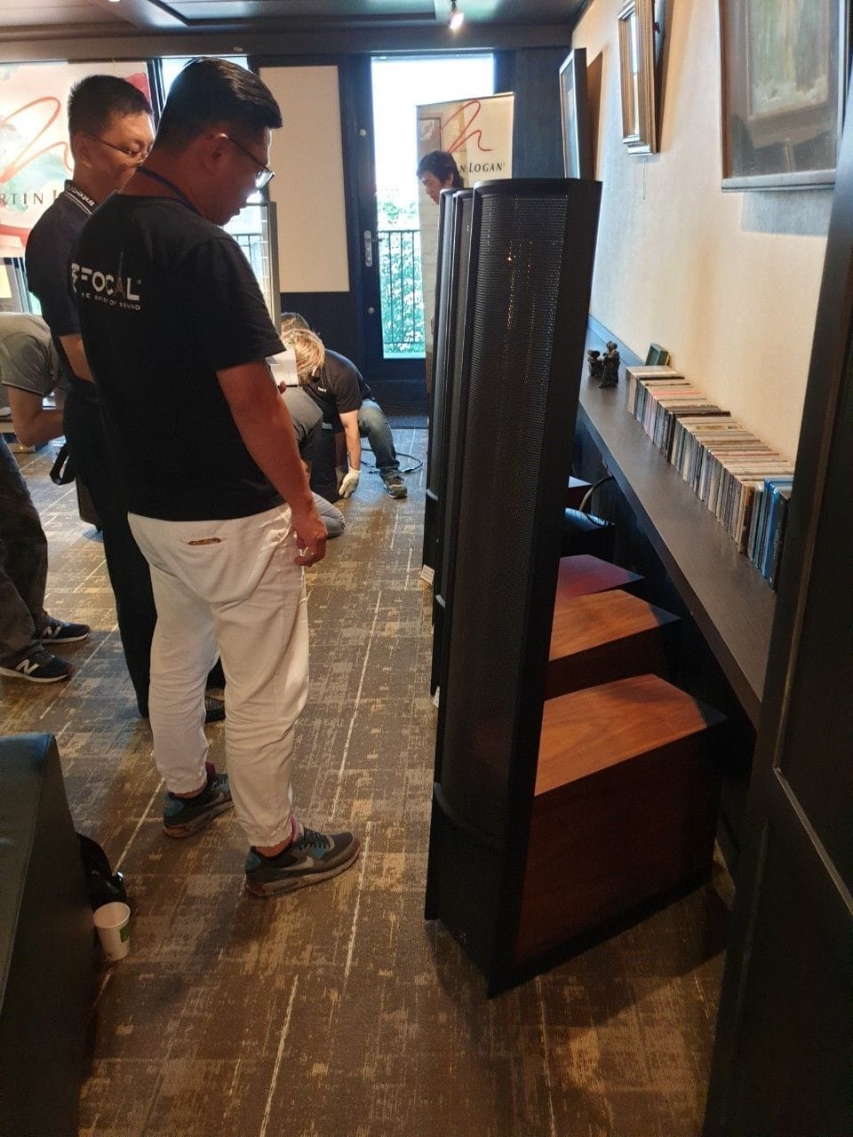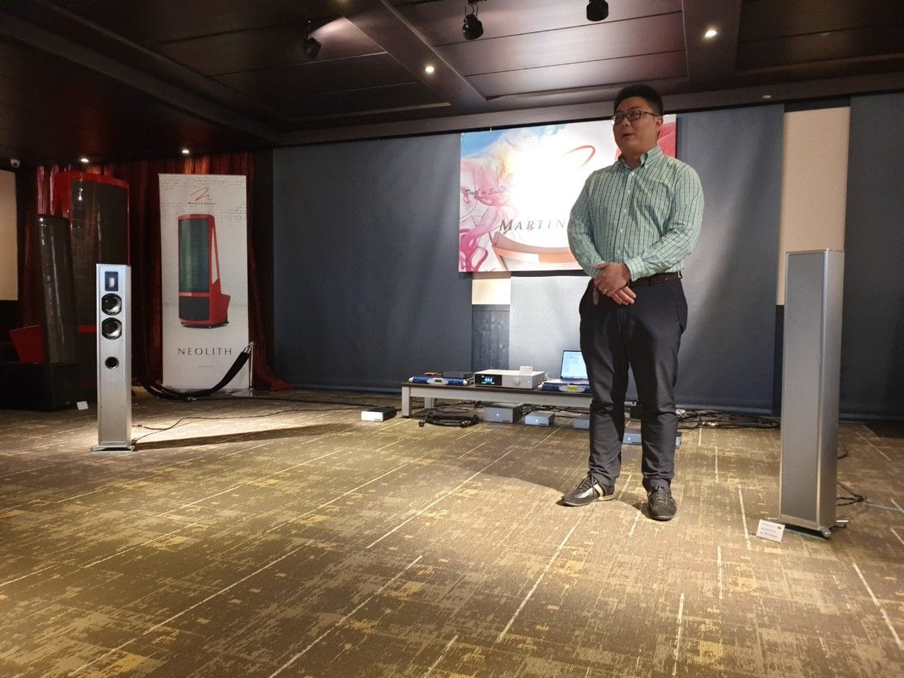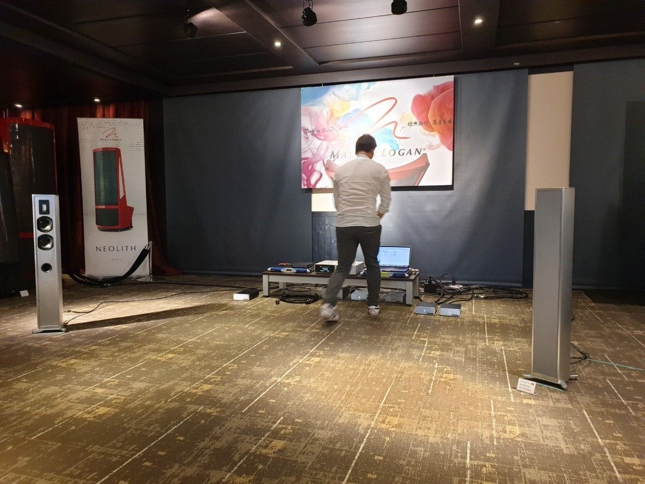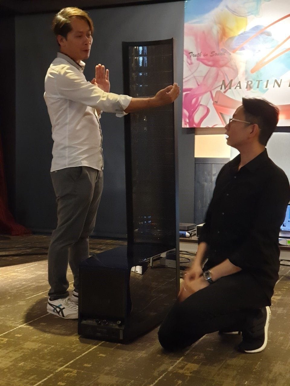 告別花草,告別羊咩咩,來到二樓這次活動的主軸~這裡有位白衣男子在調整音響器材 凡人的背影非凡的氣勢一般音響店少有靜電喇叭 Martin Logan Impression ESL 11A新世代旗艦靜電喇叭磅礡登場。