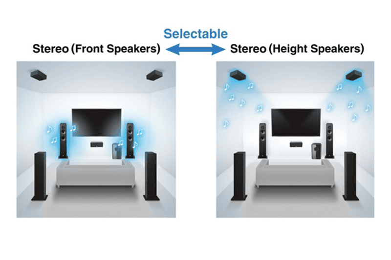 利用環繞喇叭作背景音樂播放的stereo assign功能覺得兩聲道音樂只能從主喇叭播放出很可惜嗎? 除了開啟ALL Ch Stereo模式以外,還有更優雅的選擇全新兩聲道stereo assign功能,可將純兩聲道音樂在Direct無損模式下將音樂輸出道您的環繞喇叭或天花板崁入喇叭,做從天而降的背景音樂。