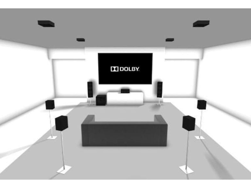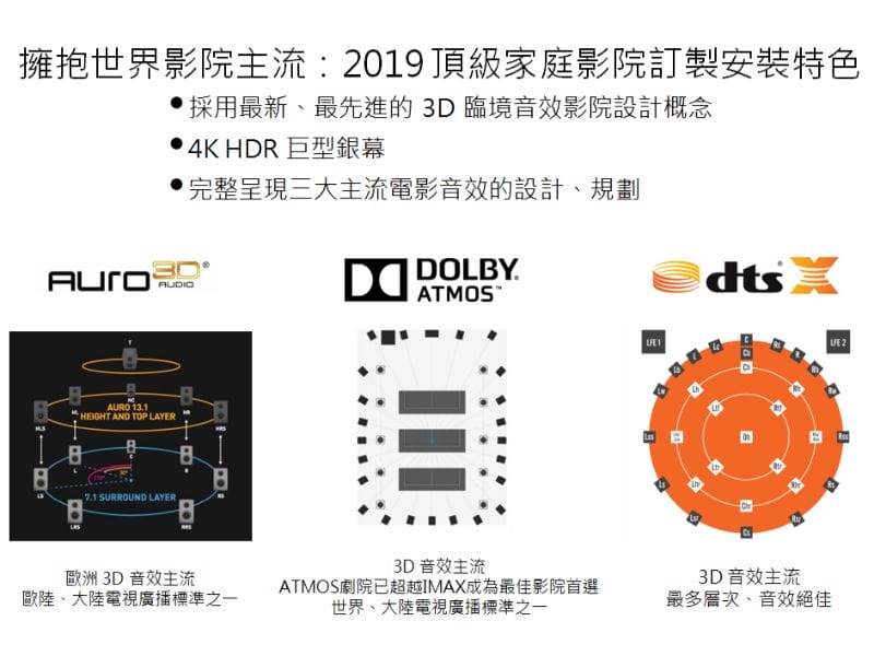 下圖為名展桃園音響旗艦館的專業電影院室,我們打造出全台數一數二的24聲道超級英雄劇院。支援當下三種最流行的電影全景聲音效 :