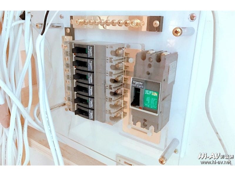 在建構一個視聽室之前,最重要的是建立良好的接地電源,名展此視聽室是採用MYSTJ特製的鍍金電源盒,搭配德國Schneider無熔絲開關,有了好的地基,當然你的房子會蓋得事半功倍!