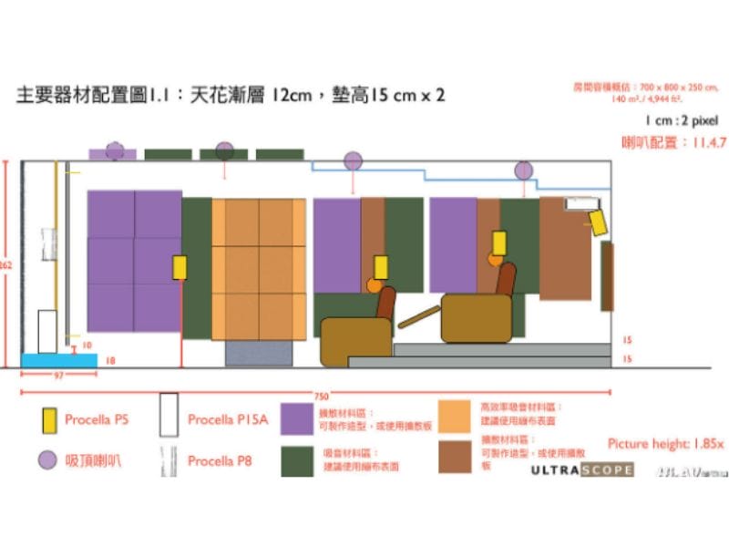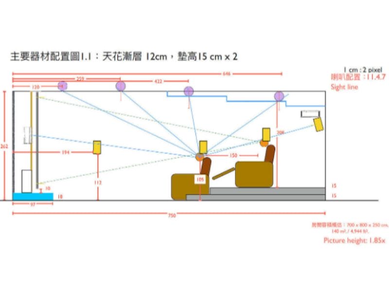 電源搞定了,再來就是給予設計師詳細的擺位配置圖,這個會根據喇叭多寡,視聽室尺寸,投影機,布幕不同而有不同的規劃建議,一般視聽室要到很完善的音效基本是11聲道起跳。