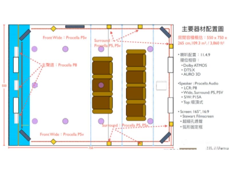 未來韌體升級後還會支援DTS:X PRO,這大概是目前台灣業界最快支援DTS:X PRO的視聽室了,整間視聽室採用瑞典Procella audio 的喇叭組成11.4.9 全景聲音場。