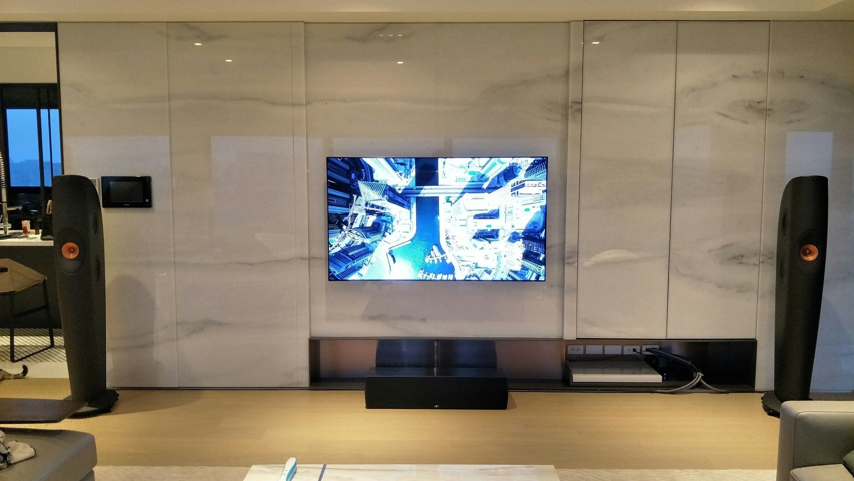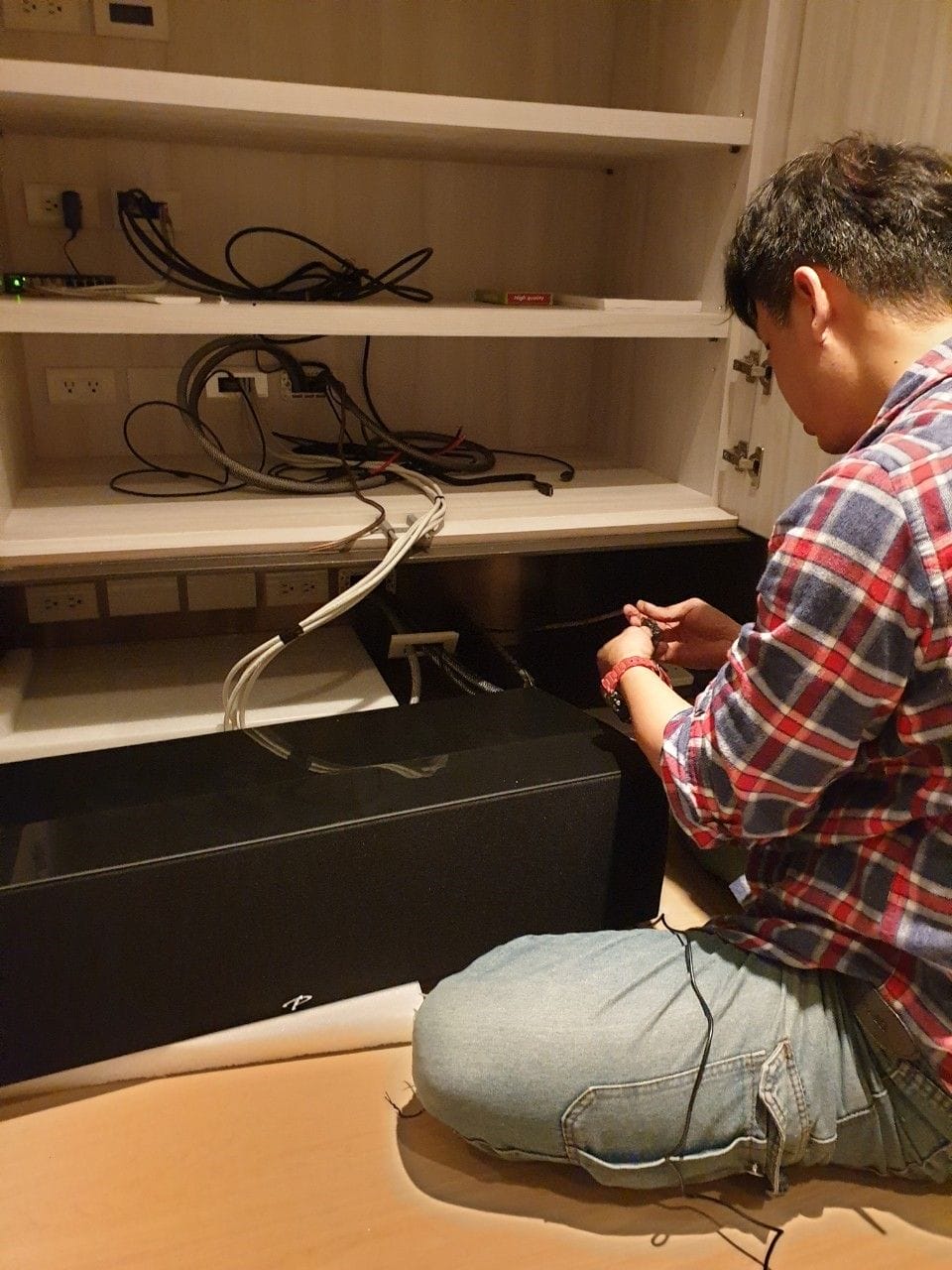 最後經過幾次名展音響師傅與設計師溝通,位置補強與調整方式,雙方合作讓屋主終於,可以開始安裝家庭劇院且不用打掉一大半的客廳